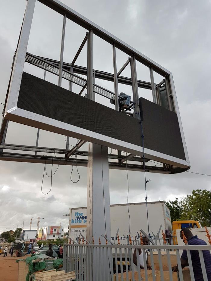 P10mm dış mekan yüksek parlaklıkta tek kutuplu çift taraflı reklam dijital led reklam panolarımız Nijerya'da yeni kuruldu. LED ekran 960x960mm alüminyum su geçirmez led panelden yapılmıştır. Nijerya'da hava sıcaklığı çok yüksek olduğundan, daha iyi ısıtma radyasyonu için alüminyum malzeme dolabı kullandık. Ayrıca led ekran için Meanwell güç tedarikçileriyle birlikte yüksek kaliteli altın tel kapsüllü DIP LED'ler kullandık, böylece soğutma için klimalar olmadan iyi çalışabilir.